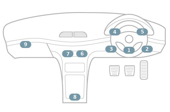 In most cars it's just below the steering wheel. It’s always inside the car and must be within 90 cm of the steering wheel. Occasionally it can be hidden behind a removable panel.