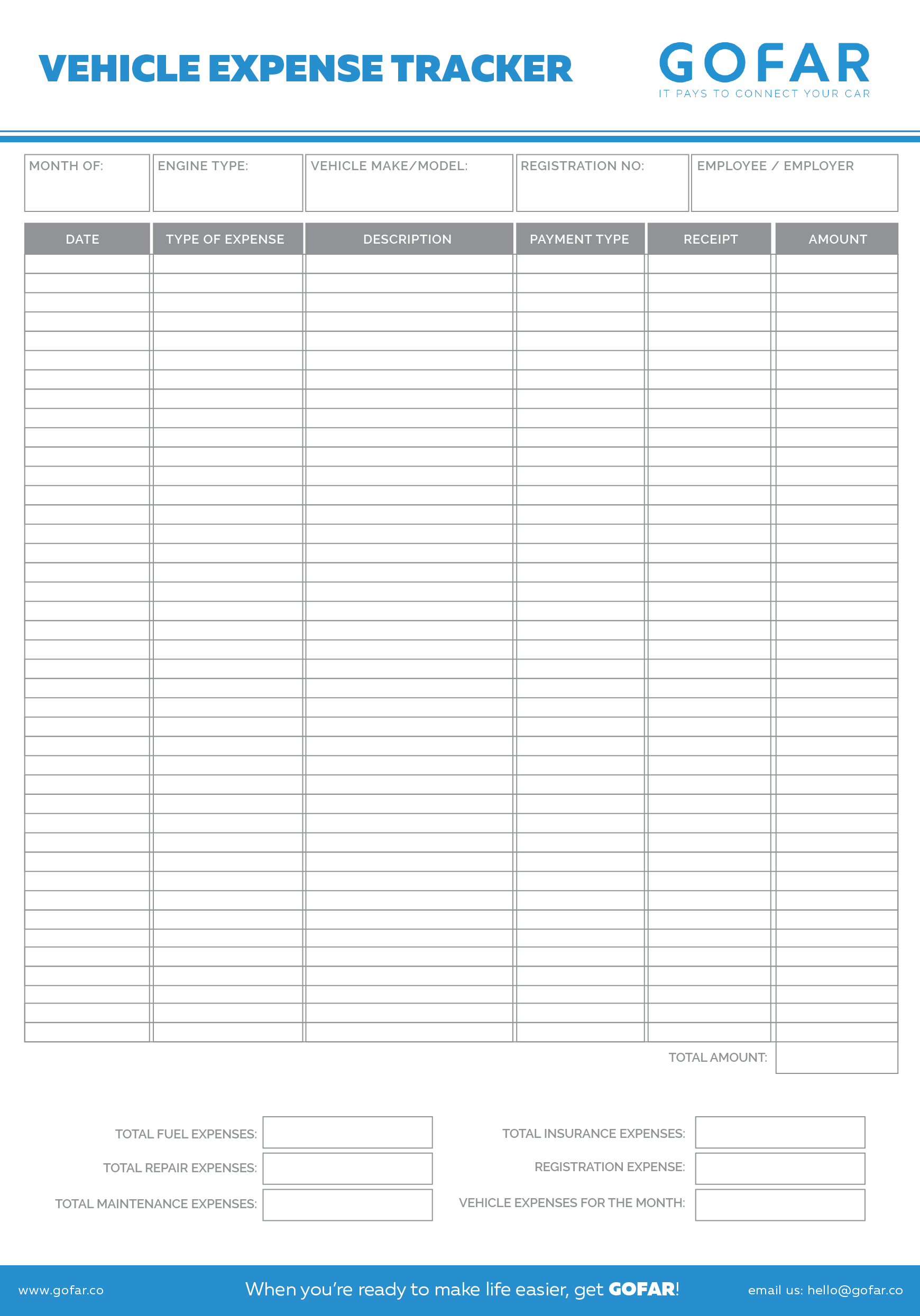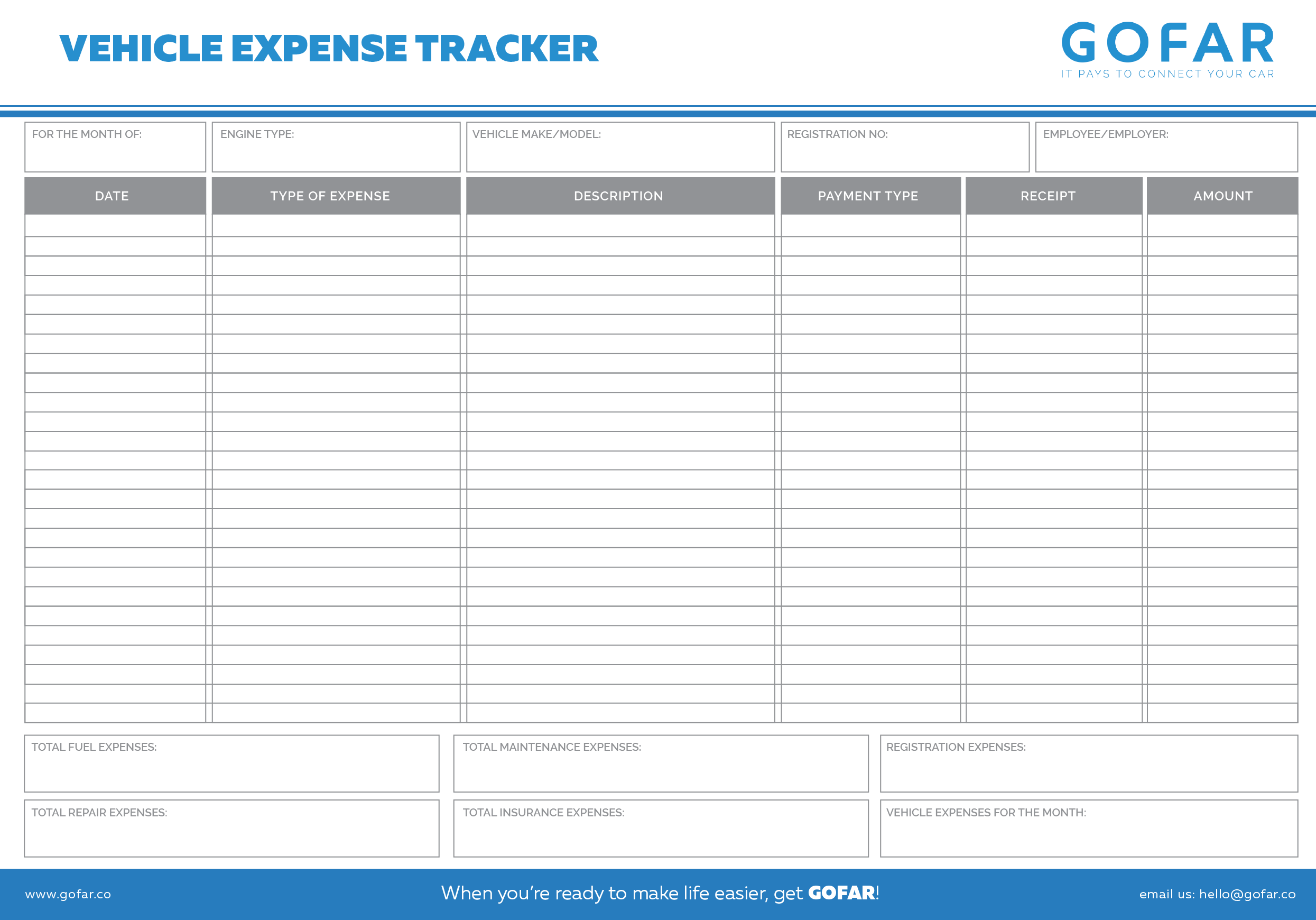 A good vehicle expense tracker automatically tracks ALL your mileage by tracking every trip your car makes (even if your phone battery dies!). That means you get a complete and accurate mileage record at tax time. Because GOFAR is a leave-in device, it can do all this and more. And to help you track all of your vehicle-related expenses, we’ve created a series of FREE vehicle expense tracker templates to help you stay on top of your logbook reporting. Available in landscape and poster formats. Vehicle Expense Tracker (Landscape) Download A4 Word Doc Download A4 PNG Download A4 PDF Download A5 Word Doc Download A5 PNG Download A5 PDF Excel Sheet: Download File (40.1 Kb) Vehicle Expense Tracker (Portrait) Download A4 Word Doc Download A4 PNG Download A4 PDF Download A5 Word Doc Download A5 PNG Download A5 PDF The Google Sheet file is View only. You need to sign into your Google/Gmail account, then click File and select “Make a copy“. Click here to open the Sheet and make your own copy. Track Work Mileage With GOFAR Log, calculate and export business expenses at the press of a button Always-in device – Never miss a trip! Available on iOS and Android How Does it Work?